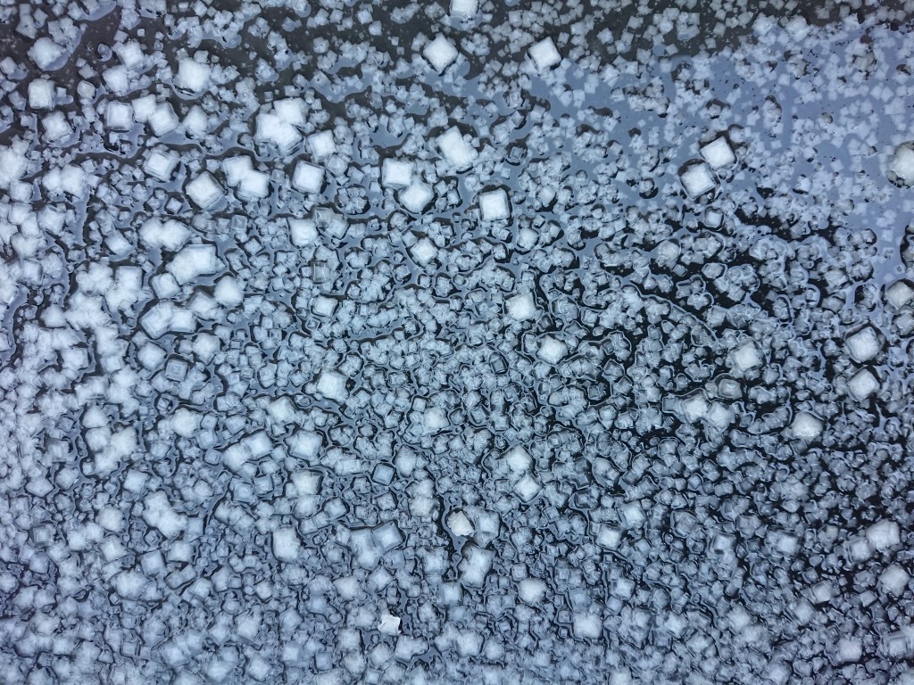 Once some salt had formed, I was able to send samples away for some final testing required for verification. These were testing for total faecal coliforms, heavy metals, and for the sodium content of the salt, which is used to calculate the sodium chloride content of the salt. This is a photo of the salt forming in one of the evaporation pods, creating perfect square salt crystals.