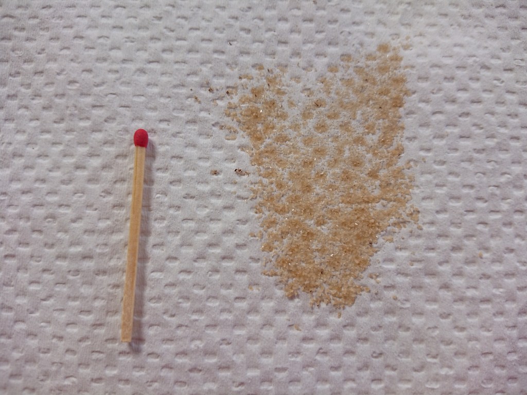 This is a photo of the mystery crystals, which feel like sand. These crystals have also meant that the first batch of salt actually has too little sodium, as these crystals are taking up space in the testing samples. Salt is required to have a sodium chloride content of 970 g/kg, which would be around 382 g/kg sodium. This first batch of salt has come back at 330 g/kg sodium, which would be around 838 g/kg sodium chloride, which is too low. Although the sodium content is too low, the levels of heavy metals such as arsenic, cadmium, and lead are below the maximum level for salt, which is great news!